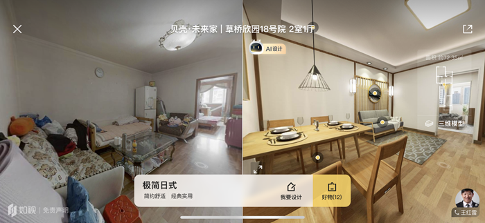 此外,贝壳团队打造出AI家装设计产品“未来家”,今年6月已经在上海上线。消费者在VR看房的同时,仅需点击页面上的“设计效果”就能看到多种风格的设计方案。用户还可以通过DIY设计功能,自行选择不同样式的硬装、家具、软装等。