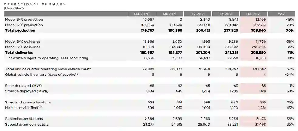 2021年,特斯拉全年交付新车93.6万辆,同比增长87%。第四季度产量同比增长70%至30.58万辆,其中Model 3和Model Y仍是主力军,两款车型合计产量同比增长79%至29.27万辆。