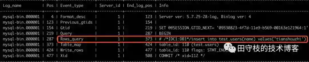 这个配置可以让MySQL在binlog中产生ROWS_QUERY_LOG_EVENT类型的binlog事件,其记录的就是执行的SQL。