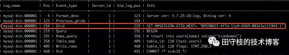 其中server_uuid是MySQL随机生成的,全局唯一。transaction_id事务id,默认情况下每次插入一个事务,transaction_id自增1。