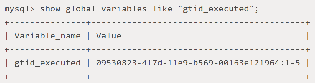 如何做到的呢?MySQL会记录自己执行过的所有GTID,当判断一个GTID已经执行过,就会忽略。通过如下sql查看: