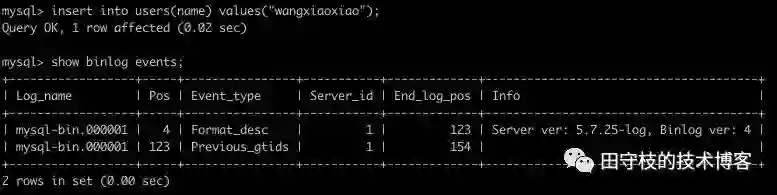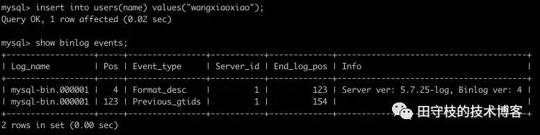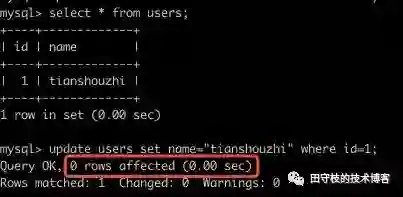 上图数据中原本有一条记录(1,"tianshouzhi”),之后执行一个update语句,将id=1的记录的name值再次更新为“tianshouzhi”,意味着值并没有变更。