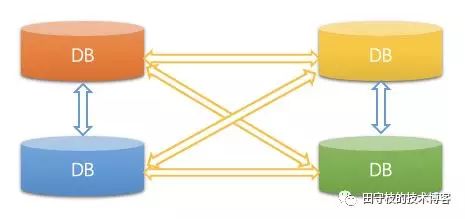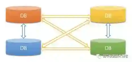 前面的架构中,只涉及到2个DB的数据同步,如果有多个DB数据需要相互同步的情况下,架构将会变得非常复杂。例如: