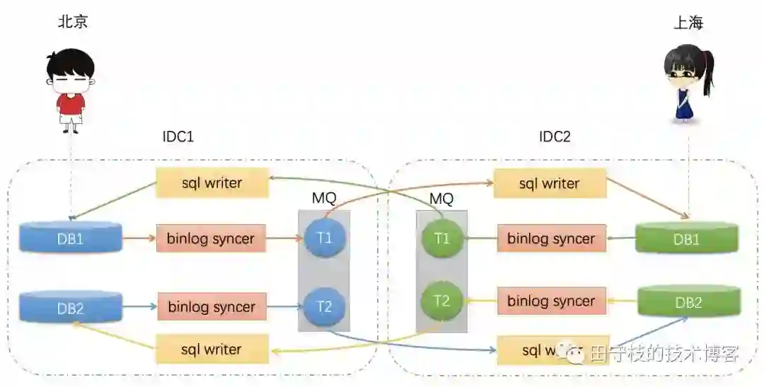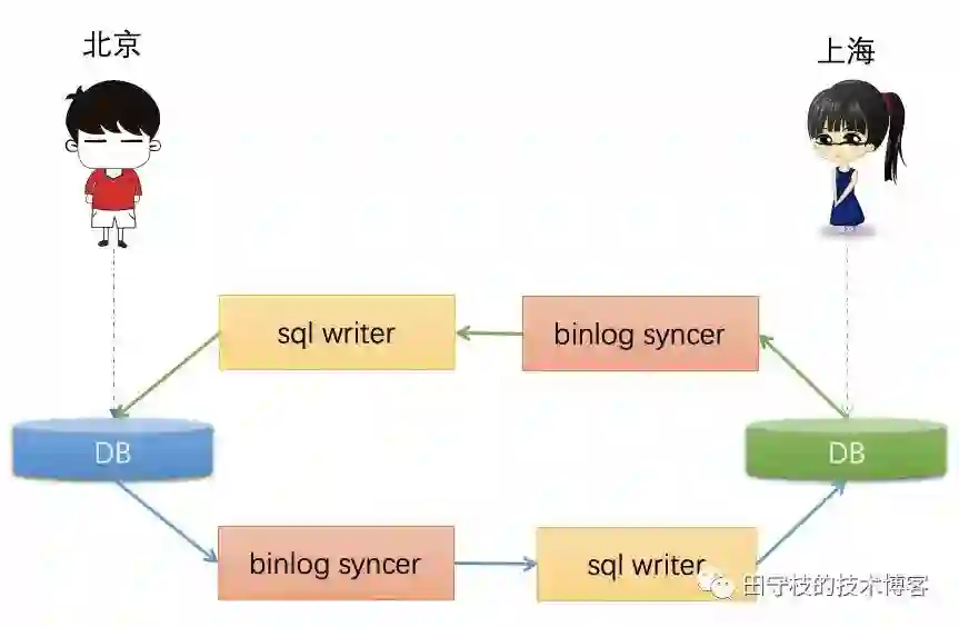 北京用户的数据不断写入离自己最近的机房的DB,通过binlog syncer订阅这个库binlog,然后下游的binlog writer将binlog转换成SQL,插入到目标库。