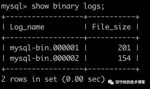 另外一些MySQL的分支,如percona server,还可以指定保留binlog文件的个数。我们可以通过show binary logs来查看当前MySQL存在多少个binlog文件,如下图: