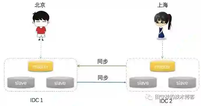 为了解决这些问题,我们可以将服务部署到多个不同的IDC中,不同IDC之间的数据互相进行同步。如下图: