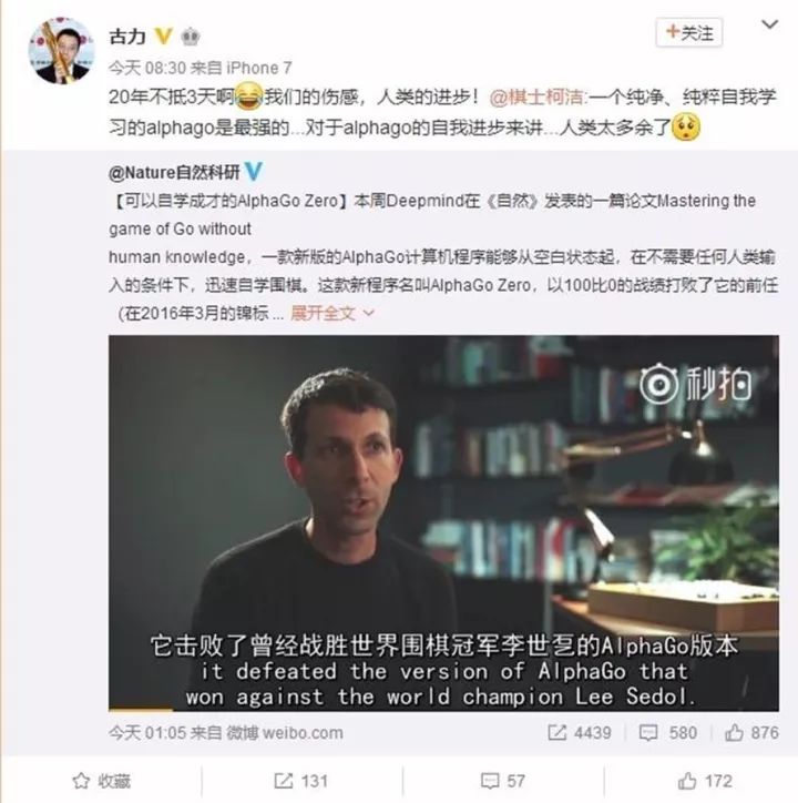 最近几年,人工智能的研究和应用,从语音识别、图像分类到基因组学和药物发现等多个领域取得了快速进展。这得益于大数据和深度学习的有力支持。可以这么讲,这波AI大跃进多是数据驱动的AI,没有大数据的喂养,没有GPU算力的普及化,就没有深度学习的成功。数据驱动的AI离不开大数据,大数据与AI形成一种共生关系:一方面,AI基础理论技术的发展为大数据机器学习和数据挖掘提供了更丰富的模型和算法,如深度网络衍生出的一系列相关技术(深度学习、强化学习、迁移学习、对抗学习等)和方法;另一方面,大数据为AI的发展提供了新的动力和燃料,数据规模大了之后,传统机器学习算法面临巨大挑战,要做并行化、要加速、要改进。当前的弱AI应用都遵从这一技术路线,大数据、深度学习和GPU计算居功至伟。然而,这些利用了大量人力、物力资源和海量数据的AI系统。却很难扩展到通用AI的程度,更不必说超AI了,比如ImageNet的上千万张图片训练出的AI系统,却无法对医疗和自动驾驶领域产生同样重大的作用。需要另起炉灶,重新花大量人力物力进行针对性的数据标注和AI系统建设。类似这些问题,对人类历史经验数据太过依赖,而这种大数据知识成本昂贵,或不可靠,或根本无法使用。因此,Super AI的研究必须要能绕过大数据,通过解码人脑智能学习机理,才能创造出一种终极算法。而阿尔狗元的横空出世,向我们展现了迈向这一目标的可能性。不需要上百万盘历史棋谱数据,仅训练3天(自己左右互搏490万棋局),只需要4片TPU就战胜了旧版AlphaGo 系统,而比分是100:0;旧版阿尔法狗采用了48片TPU,需要花几个月学习几千万盘棋局才完全战胜人类。以致于柯洁面对新版的阿尔法狗元,发表了如下无力吐槽。