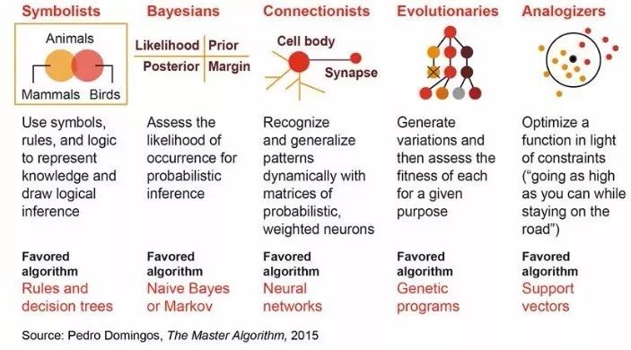 几十年来,机器学习算法研究的五大门派(如上图)一直以来都在彼此争夺主导权。 (1)符号派:使用符号、规则和逻辑来表征知识和进行逻辑推理,最喜欢的算法是:规则和决策树。(2)贝叶斯派:获取发生的可能性来进行概率推理,最喜欢的算法是:朴素贝叶斯或马尔可夫。(3)进化派:生成变化,然后为特定目标获取其中最优的,最喜欢的算法是:遗传算法。(4)类推派:根据约束条件来优化函数(尽可能走到更高,但同时不要离开道路),最喜欢的算法是:支持向量机。(5)联结派:使用概率矩阵和加权神经元来动态地识别和归纳模式,最喜欢的算法是:神经网络。上述传统算法和各大门派的机器学习算法需要人类知识、规则、经验和数据的支持,是一种归纳和演绎学习的范畴,这种学习受限于数据本身,即使是大数据也不能全样本覆盖,而且包含各种噪音、错误或有偏见的数据,这样使得学习出来的模型也很难是最优的。而终极算法要能进行自我创造和学习,根据学习目标去自我创造样本、自我学习来加深对事物的理解从而获得学习能力,这才是真正的智能。能否实现终极算法,怎么实现终极算法,下面从阿尔狗元的强化学习、人类大脑新皮层的学习机理和深度学习网络三个方面的融合来进行探讨分析。