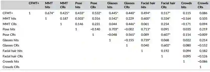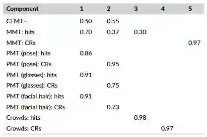 第一个因素来自于目标当前的措施:命中了PMT的三个块,命中了MMT,以及CFMT的总体性能。第二个因素来自三个匹配块的正确的拒绝分数,以及来自CFMT的总体分数。在人群测试中,第三和第四个因素分别代表了成功和正确的拒绝;第五个因素对MMT的正确拒绝有很高的负载。下表显示了一个完整的相关矩阵。