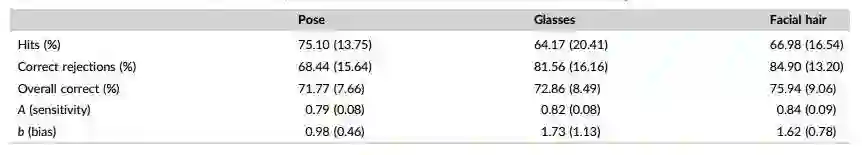 我们的下一组分析检查了三个新的人脸匹配测试块(即姿态、眼镜和面部毛发)的性能一致性。每个块上所有参与者的命中、正确拒绝和总体准确性被总结,并使用控制数据计算每个度量的规范。