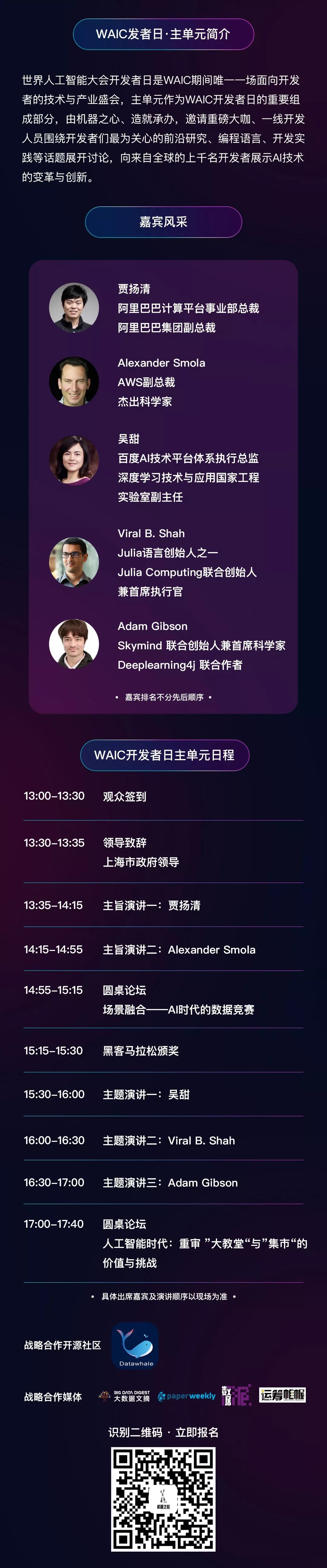 WAIC 开发者日主单元由世界人工智能大会组委会主办,机器之心、造就承办,包含 5 大主题演讲、2 个圆桌论坛,邀请重磅大咖、一线开发人员围绕开发者们最为关心的前沿研究、编程语言、产业应用等话题展开讨论。