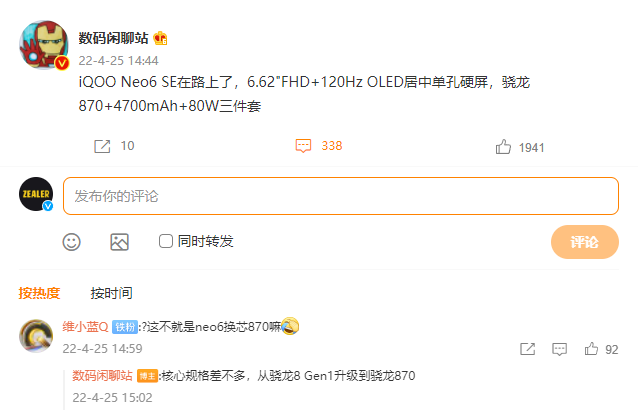 @数码闲聊站 今日透露,iQOO Neo6 SE 即将发布。该机将采用 6.62 英寸 FHD + 分辨率 120Hz 刷新率 OLED 居中单孔硬屏,搭载高通骁龙 870 芯片,内置 4700mAh 电池,支持 80W 快充,核心规格与 Neo6 差不多,只是从骁龙 8 Gen1 升级到了骁龙 870。值得注意的是,iQOO 在 4 月 13 日刚刚发布了 iQOO Neo6,该机配备 6.62 英寸 2400×1080 AMOLED 直屏,120Hz 刷新率,搭载高通骁龙 8 Gen 1 芯片 +LPDDR5 内存+超频版 UFS 3.1 闪存,还有 Pixelworks 独立显示芯片 Pro,售价 2799 元起。