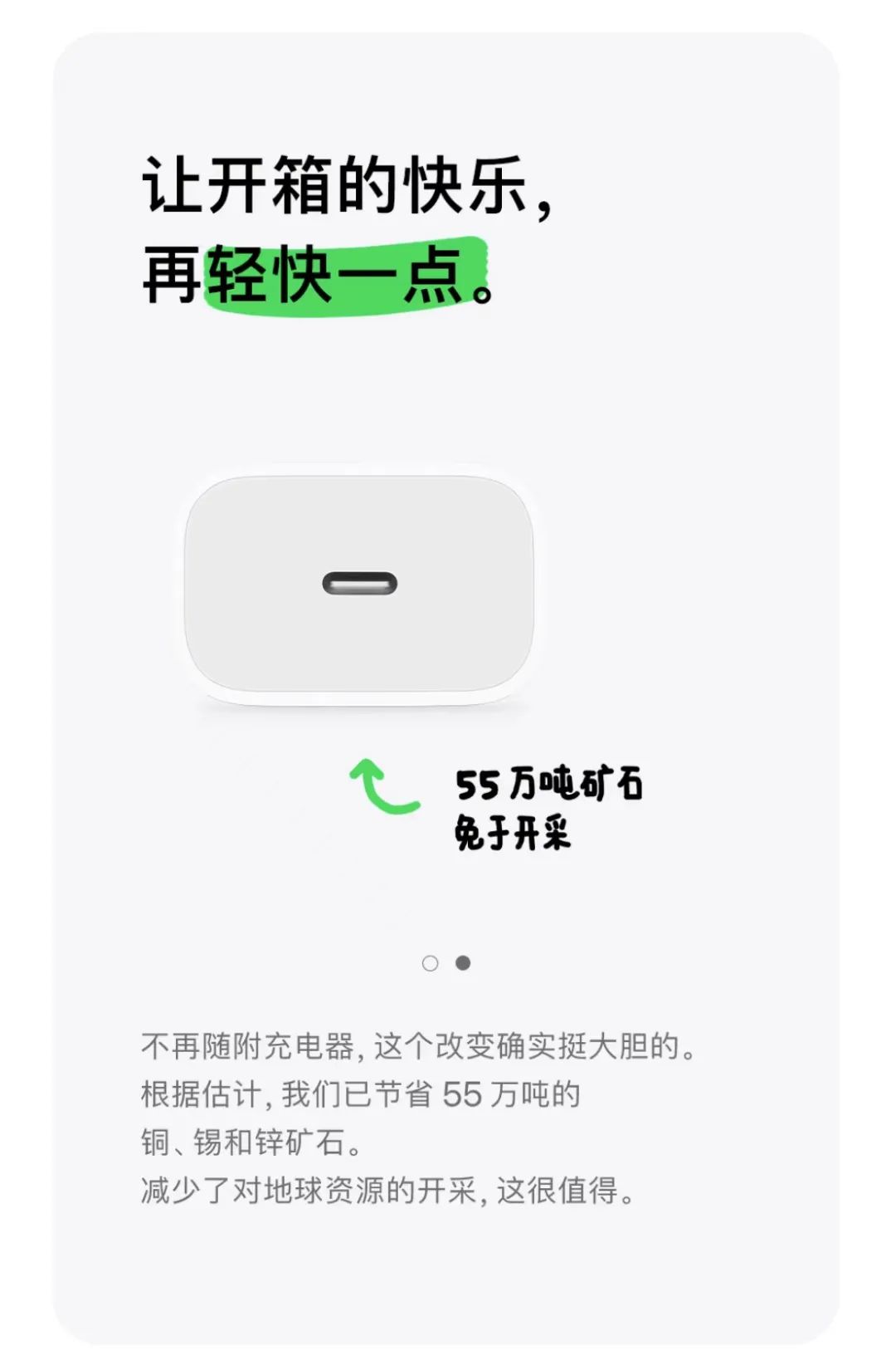 苹果公司近日公布了这两年来的环保成绩单:通过重新设计,苹果彻底淘汰了包覆 iPhone 盒体的塑料膜,减少了 600 吨塑料用量;不再随附充电器,据估计,苹果已节省 55 万吨的铜、锡和锌矿石。苹果表示,“不再随附充电器”这个改变确实挺大胆的,减少对地球资源的开采,这很值得。