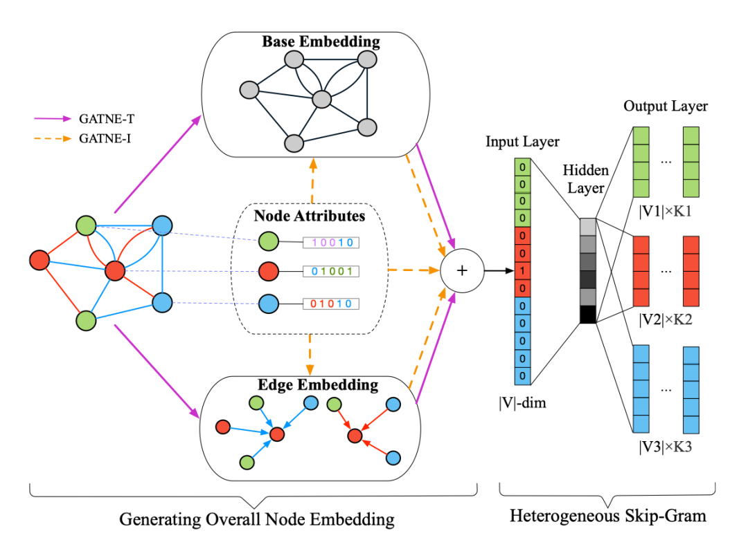 为异构网络中的每个结点学习一个基本表示(base embedding),在结点的每种边类型下都学一个表示(edge embedding),将两类表示合并作为最后的表示。