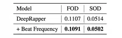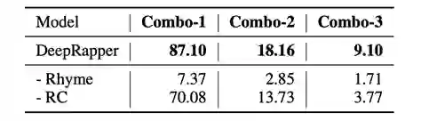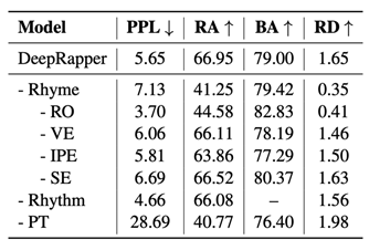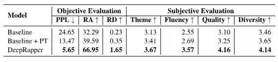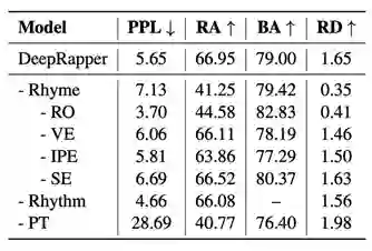 表7展示了 DeepRapper 客观和主观的评估结果,并与两个基线模型进行了比较。Baseline 与 DeepRapper 结构相同,但是没有韵律模型;Baseline+PT 则是采用了预训练的 Baseline。结果显示,DeepRapper 在客观指标 Perplexity (PPL)、Rhyme Accuracy (RA)、 Rhyme Density (RD),和主观指标 Theme (主题是否鲜明)、Fluency (语言是否流畅)、Quality (韵脚质量)、 Diversity (韵脚多样化)上都远远超出了各个 Baseline。