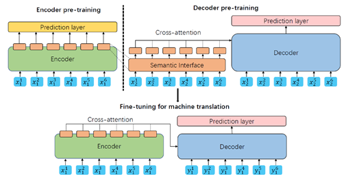如图11所示,本文提出的方法可分为两步。第一步如图中的上半部分所示,利用单语数据,通过预定义的语义交互界面,分别预训练编码器和解码器。在预训练的过程中,编码器的目标是将输入映射到该交互界面定义的空间中,解码器的目标是通过交叉注意力模块利用该空间中的信息完成解码。