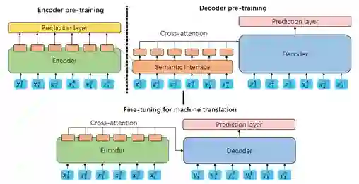 该方法通过一个与语言无关的语义交互界面 SemFace,将编码器和解码器的预训练过程进行交互。在预训练过程中,编码器的目标是将源语言的输入通过特征提取映射到 SemFace 定义的语义空间中;解码器的目标则是利用该语义空间的信息生成目标语言的句子。通过定义 SemFace,编码器和解码器的预训练过程可以分别完成,源语言和目标语言的跨语言信息可以在 SemFace 定义的与语言无关的空间中进行表示。同时在解码器的预训练过程中,交叉注意力模块的参数也可以得到训练。预训练完成后,编码器和解码器可以进行自然地拼接,直接进行后续机器翻译的微调。