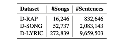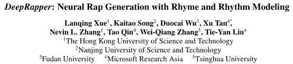 Rap 是一种带有押韵和节奏的特殊音乐形式。Rap 的自动生成面临着许多挑战:一方面,由于没有现存的含有节奏信息的数据集,之前的 Rap 生成系统只能生成纯歌词;另一方面,之前的 Rap 生成系统对于押韵的建模也有所欠缺,很难自动生成多押、连押和连环押等高质量 Rap 的必要成分。因此,微软亚洲研究院的研究员们提出了 DeepRapper,利用一个基于 Transformer 的 Rap 生成模型,来生成押韵且有节奏信息的 Rap 歌词。