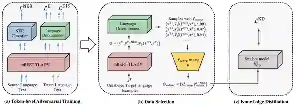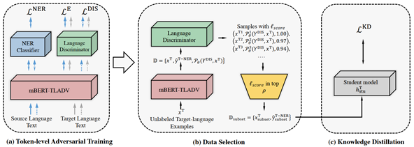 (3)知识蒸馏:利用(2)中选出的目标语言文本子集,基于(1)中所得的源语言 NER 模型,以知识蒸馏的方式训练学生模型(目标语言 NER 模型)。