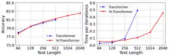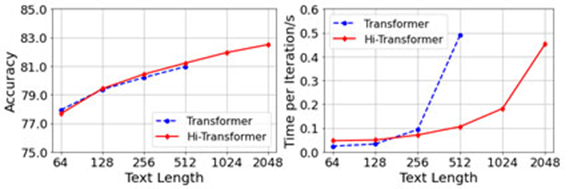 图9进一步比较了 Transformer 和 Hi-Transformer 在不同文档长度下的性能和速度。可以看到,当输入同样长度文档时,二者的性能非常接近。当文档长度较长时,Hi-Transformer 的速度显著优于 Transformer。因此,Hi-Transformer 能够处理 Transformer 由于速度和显存限制而无法处理的较长文档,并且能够取得和 Transformer 接近的效果。