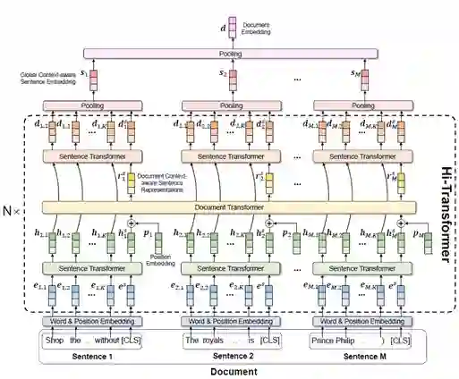对此,微软亚洲研究院的研究员们注意到,长文档通常由多个句子组成,不同句子的语义既相对完整自洽。基于这两点,研究员们提出了一种层次化 (Hierarchical) 和交互式 (Interactive) 的Transformer 结构:Hi-Transformer,来实现高效和准确的长文档建模,如图8所示。