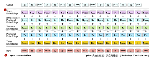 对于节奏的建模,DeepRapper 在歌词中插入了一个特殊的 [BEAT] Token,显式地将节奏信息和歌词信息融合,将节奏预测简化成语言模型里特殊 Token 的预测。图5是 DeepRapper 模型的输入输出示意图。