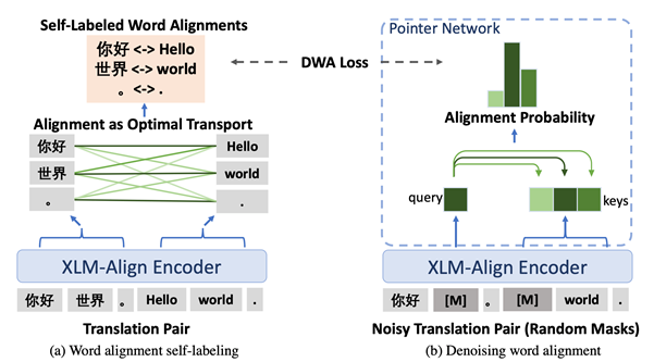 预训练跨语言语言模型(Pretrained Cross-Lingual Language Model)在自然语言推断、问答、序列标注等诸多任务上展现了强大的跨语言迁移能力。例如,仅用英语的问答训练数据来微调预训练跨语言语言模型,得到的模型就可以直接在多个语言上实现问答任务。以往的跨语言预训练任务更关注句子级别的对齐,隐式地鼓励跨语言对齐,而忽略了显示的词级别的细粒度的对齐。
