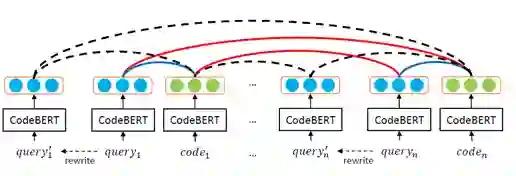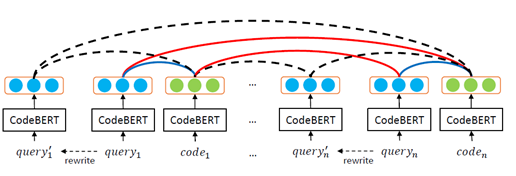 除数据外,本文还提出了基于对比学习的查询-代码匹配模型(CoCLR,Code Contrastive LeaRning),如图3所示。通过对查询进行重写和使用同批数据的不同代码,来获得更多的训练数据,以增强模型的匹配能力。