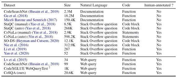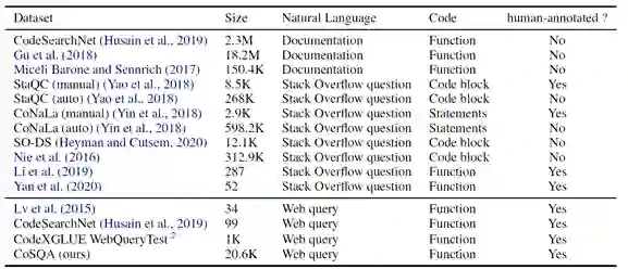 CoSQA 中的自然语言查询来源于必应(Bing)搜索引擎的查询日志,代码选用了 CodeSearchNet 中的 Python 函数(如表3所示),并且研究员对函数中自带的自然语言注释也进行了保留,以促进查询和代码间更好的匹配。