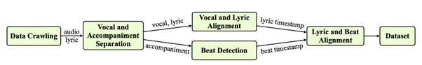 针对数据缺乏的问题,研究员们首先设计了一个收集数据的 Pipeline(如图4),收集了大量歌曲数据,并且对歌曲进行了一系列处理。