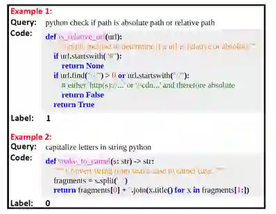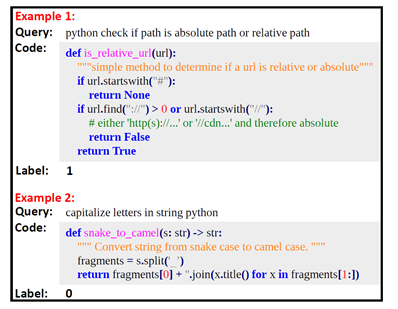 代码搜索(Code Search)旨在给一个自然语言查询(Query)找到一段合适的代码,并且通过使用这种技术,能够有效地提高程序员们的生产力。但是训练一个有较好效果的代码-查询的匹配模型,需要大量的监督数据。因此,微软亚洲研究院的研究员们提出了 CoSQA 数据集(Code Search and Question Answering),其中含有20,604个真实网页查询和代码的配对数据,每一对都有一个0/1标签来判断代码是否可以回答查询的问题,图2中包含了 CoSQA 的两个例子。