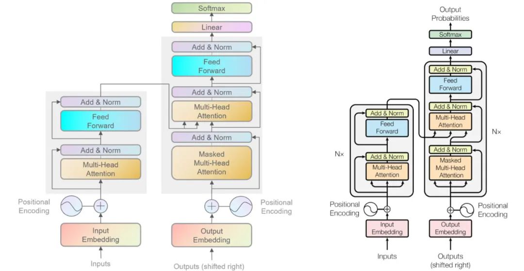 下边这张图是不是很面熟?这就是大名鼎鼎的 Transformer 架构,右边是谷歌大脑论文《Attention Is All You Need》中的 Transformer 架构原图,左边是用上述模板重新画出来的,还原度是不是很高,而且看起来很漂亮?