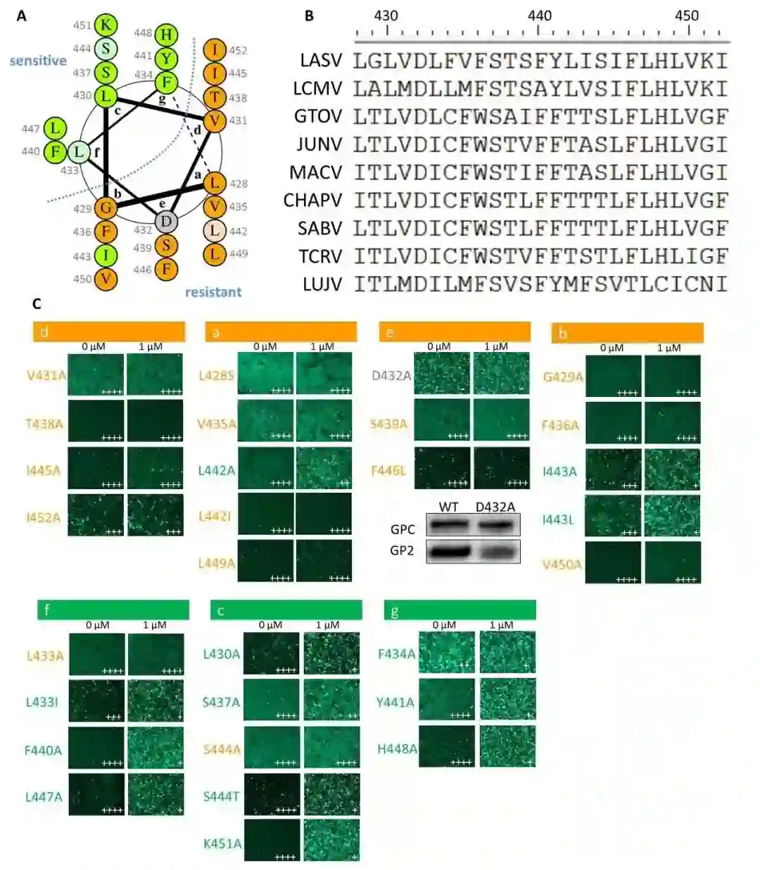 研究发现耐药点突变L428S和F446L都是位于GP2 TM α螺旋的同一侧,因此,研究人员猜想GP2 TM存在药物的耐药性/敏感性界面,接下来他们对GP2 TM进行丙氨酸扫描膜融合实验并通过化合物29鉴定其敏感性,结果发现GP2 TM α螺旋针对化合物29明显划分为耐药性/敏感性界面(图2)。