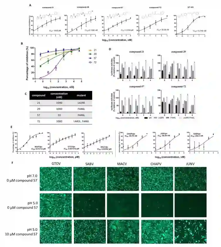 研究人员通过对已报道的由SIGA公司筛选的LASV特异性进入型抑制剂ST-161进行构效关系优化,得到72种衍生物。通过在不同细胞上进行LASVpv和LASVrv抗病毒实验鉴定出四种SI最优的LASV进入抑制剂:化合物21、29、57、72,其IC50分别为18.92 pM、189 pM、0.2784pM。令人惊喜地发现,化合物57对沙粒病毒科其他四级病原也有显著的抑制效果,其中对Junín virus (JUNV)、Sabiá virus (SABV)、Chapare virus (CHAPV)的抑制水平达到nM级;对Guanarito virus (GTOV)和Machupo virus (MACV)的抑制水平更是达到pM级,有望成为沙粒病毒的广谱性抑制剂。