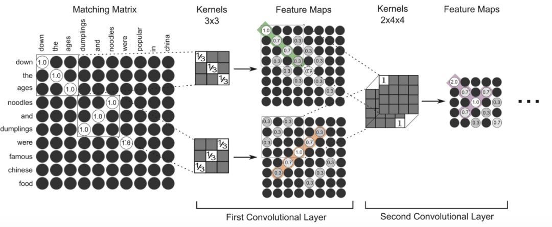总的来说,通过多层的卷积,MatchPyramid可以在单词或者句子级别自动捕获重要的匹配模式。