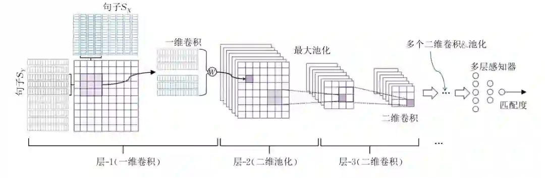 句子中每个词表示为词向量后,每个句子构成一个矩阵,用滑动窗口来选择词向量组作为基本单元进行卷积操作。假设有两个句子x和y,首先从sentence x中选取一个向量a,再从sentence y中将每一个向量和a进行卷积操作,通过这种操作,将两个句子中的向量进行两两组合,构成2D矩阵,该矩阵作为两个句子交互作用的一个初步表示。随后的卷积以这个2D矩阵为基础进行“卷积+池化”的操作若干次,最后得到一个描述两个句子整体关联的向量,最终由一个MLP来综合这个向量的每个维度得到匹配值。