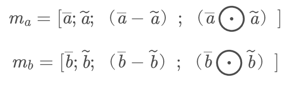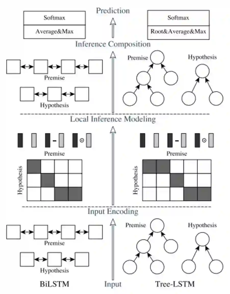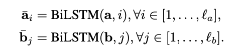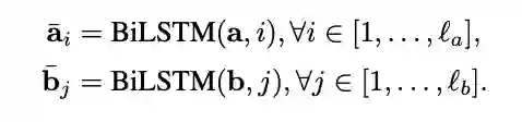 上述两步称为Local Inference Modelling,相当于先用attention机制计算出a句某一单词和b句中各个单词的权重,然后再将权重赋予b句各个单词,用来表征a句中的该单词,形成一个新的序列,b句亦然。简单来说可以这样理解:a句中有个单词“boy”,首先分析这个词和另一句话中各个词之间的联系,计算得到的结果标准化之后作为权重,用另一句话中的各个词向量按照权重去表示"boy"。