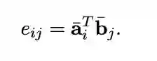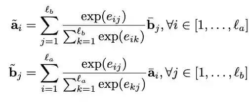 接下来就是需要分析这两个句子之间的联系了,这层是ESIM的点睛之笔, 主要在句子基础上表征了两个句子词语之间的关系,并凸显了某一句中的单词对另一句各单词之间的产生的影响。首先,使用点积的方式计算a句中第i个词和b句中第j个词之间的attention权重。