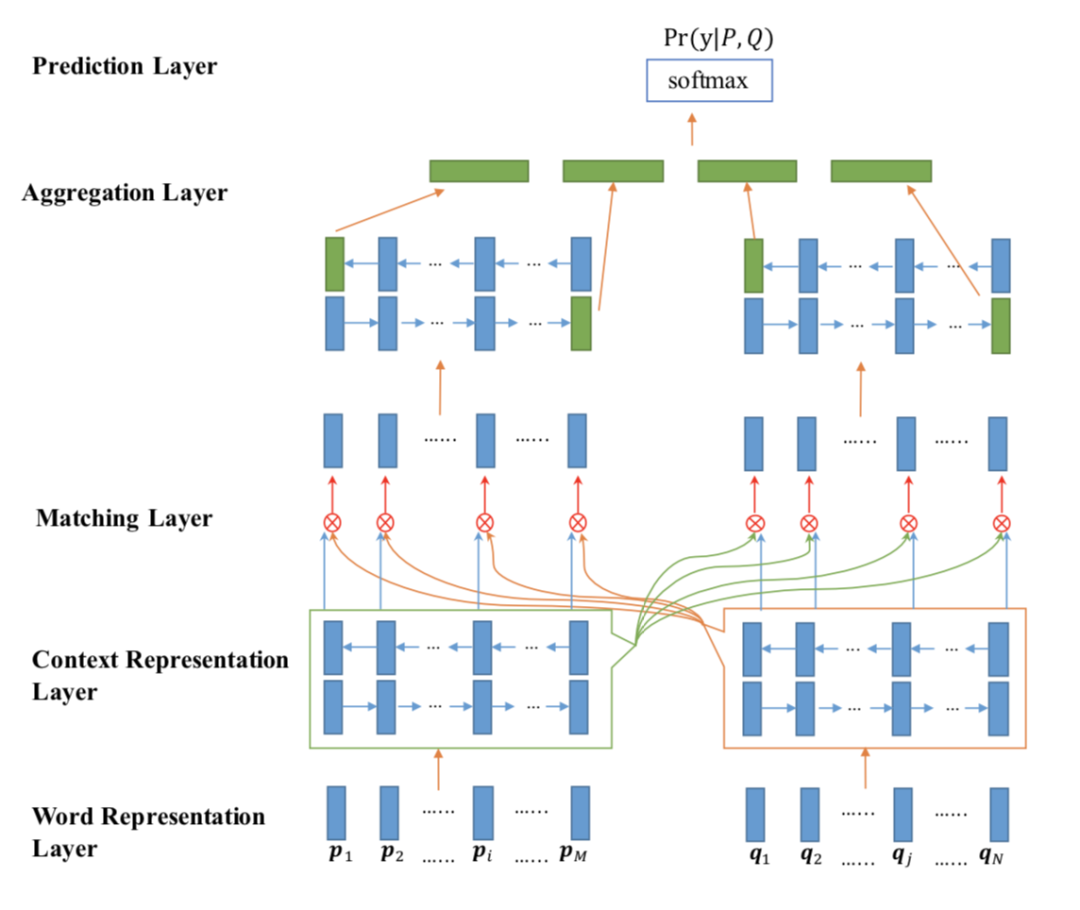 Bimpm(Bilateral Multi-perspective Matching) 即双向多角度匹配,2017年由IBM提出,原文传送门:https://arxiv.org/pdf/1702.03814.pdf。 相信在阅读了ESIM之后对“双向”有了一定的理解,该模型的亮点在于如何“多角度”进行匹配。