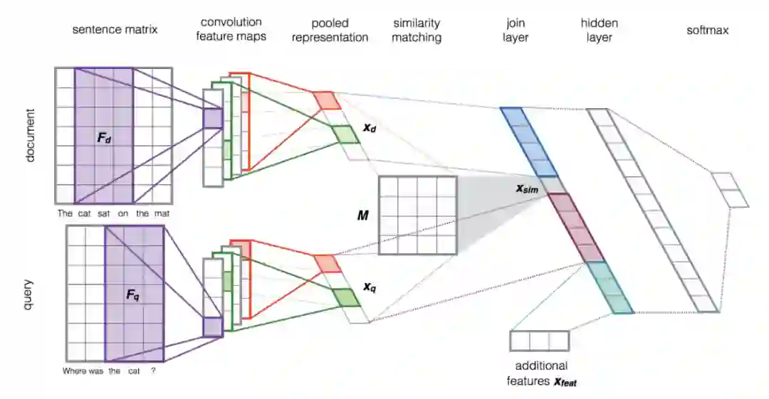 模型先分别对 query 和 document 做卷积和max池化,得到文本的语义向量,接着通过 M 矩阵变换得到语义向量的相似度,然后把 query 语义向量、query&document 的语义相似度、document 语义向量、外部特征拼接成n维向量,外部特征的加入是作者考虑到可能无法在词表中找到某些专有名词,从而会造成信息缺失,因此文中使用word overlap(单词重叠)和IDF word overlap(IDF加权后的单词重叠)作为外部特征,以加强query和document之间的关联关系。将拼接好的n维向量输入一个非线性变换隐层,最终用 softmax做概率归一化。用softmax 的输出作为监督信号,采用 cross-entropy 作为损失函数进行模型训练。