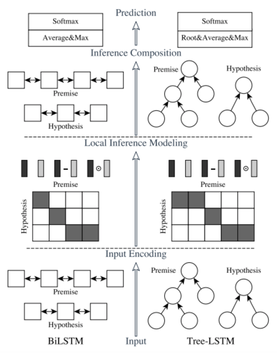 ESIM一共包含四部分,输入层、交互层、聚合层和预测层。