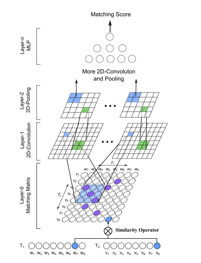 虽然ARC-II和PairCNN更早地让两段文本进行了交互,但是这个交互的意义其实并不明确,层次化的过程也比较模糊。MatchPyramid重新定义了两段文本交互的方式---- 匹配矩阵,该模型2016年由中科院提出,原文传送门https://arxiv.org/abs/1602.06359。作者基于此模型,在2017.3-2017.6 Kaggle的Quora Question Pairs 比赛上,取得了全球第四的好成绩。