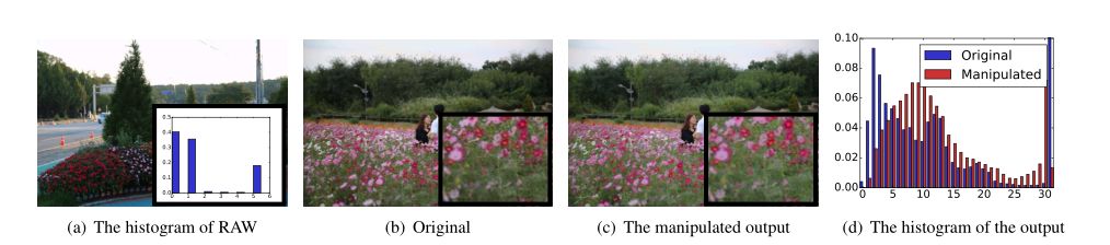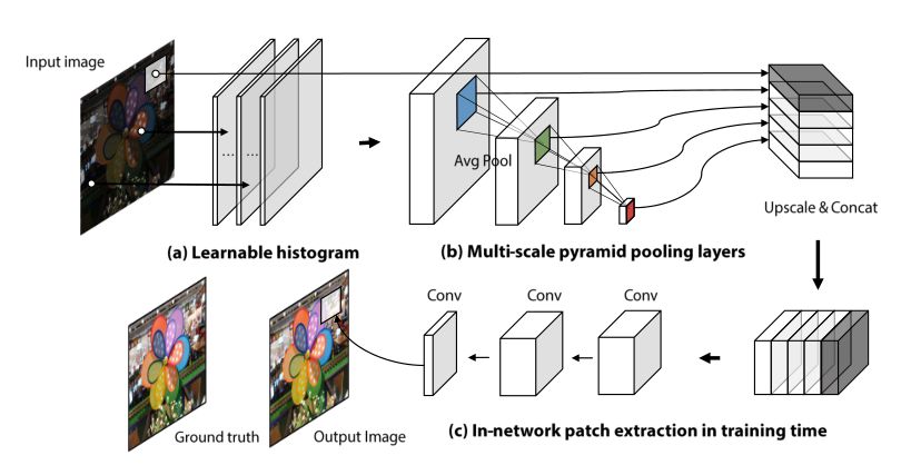 在场景建模时,往往需要相机内部的图像处理,为此我们提出了一个新颖的深度学习网络框架来解决这一问题。这种技术通常被称为图片的辐射校正,将原始图片从处理后的图片(例如JPEG格式)中恢复过来,这在许多计算机视觉任务中不可或缺,而要做到这一点就需要物理上精确的辐射值。以前的工作都依赖于确定性的成像模型,这种方法无论场景如何变化,颜色转换始终保持不变,因此他们只能应用于在手动模式下拍摄的图片。在本文中,我们提出了一种数据驱动的方法来学习在相机内部场景依赖和局部变换的图像处理过程,这一过程是在自动模式下进行的。我们的方法将全局和局部的场景文本经过多尺度可学习的直方图金字塔整合为像素层的特征。实验结果显示,我们的方法可以在自动模式下,在不同相机之间完成不同方向的转换(从RAW到sRGB,从sRGB到RAW),同时我们也展示了我们的方法在图像去模糊上有着优良的表现。