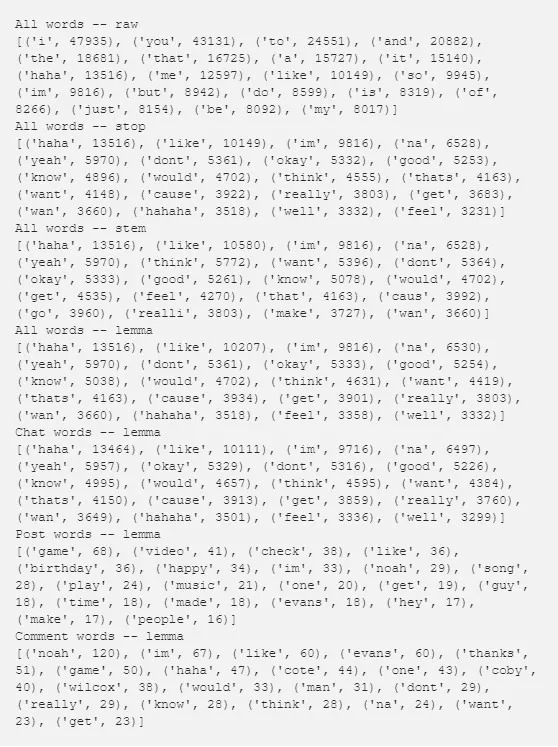 我喜欢只看我的词汇,所以这就是为什么我只记录我的个人来源。我觉得有趣的是我经常在聊天中使用“哈哈”的变体。我的大多数评论都是某人的名字。