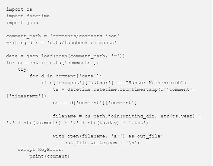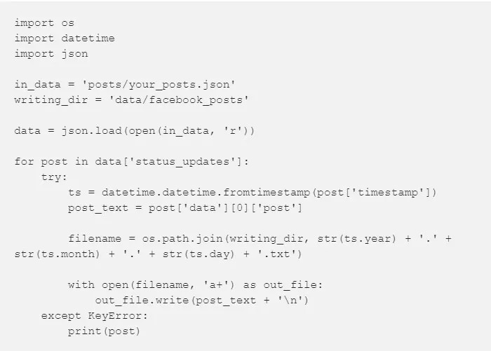 我打算下载所有的 Facebook 数据,但是我并不希望在这个课题中使用所有的 Facebook 数据。对这个课题而言,我只关心我的帖子,评论和聊天历史。为了做到这些,我为每个种类的数据写了一个预处理脚本来下载所需要的内容到文本文件。