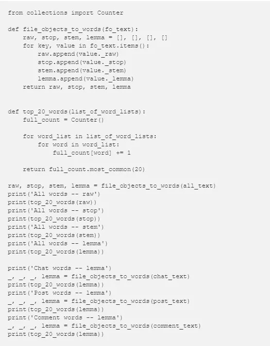 让我们从基础开始吧。我们将这些单词列表加载到各种来源中。让我们来算一下,看看我们最常用的词是什么。让我们看看我们的前 20 名。