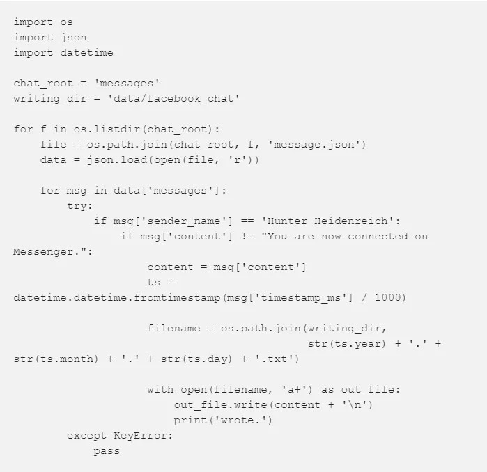 你在这里会看到的是我正在遍历我的 messages 文件夹中的所有子文件夹。我从那里做的是我在信息 JSON 中读到的。对于每个可用的信息,我会检查它是否是我发送的信息。如果它不是 Facebook 默认的“You are now connected on Messenger”。接着我会使用它。我给信息添加时间戳,然后将其添加到采用 year.month.day.txt 格式的文件中,这是我标记所有文本文件的格式,以便我可以记录词汇随时间的变化。