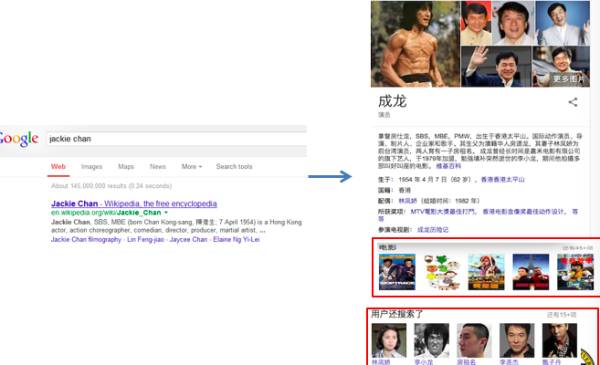 知识图谱这个概念是谷歌提出的,谷歌做知识图谱自然是跟搜索引擎相关,即提供语义搜索。这里语义搜索跟传统搜索引擎的区别在于搜索的结果不是展示网页,而是展示结构化知识,如下图(图 1)所示:
