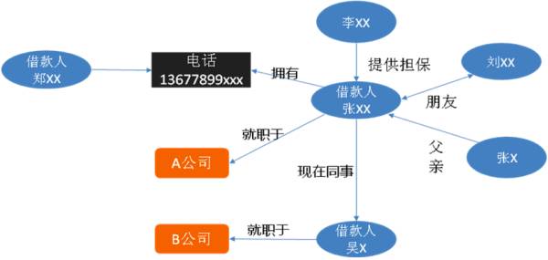 通过融合来自不同数据源的信息构成知识图谱,同时引入领域专家建立业务专家规则。我们通过数据不一致性检测,利用绘制出的知识图谱可以识别潜在的欺诈风险。比如借款人张 xx 和借款人吴 x 填写信息为同事,但是两个人填写的公司名却不一样, 以及同一个电话号码属于两个借款人,这些不一致性很可能有欺诈行为 (图 5)。