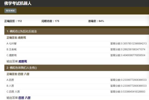 东南大学认知智能研究所借鉴了 Watson 技术,启动了一个佛学考试机器人项目,旨在回答佛学相关问题。为了做这个系统,需要先构建一个佛学知识图谱,通过图谱和佛学相关的网页,利用问答技术解题。考试题目例子如下: